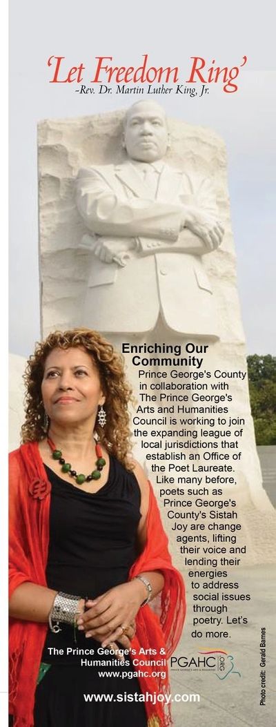To find information about Sistah Joy's work as Poet Laureate of Prince George's County, visit the Poet Laureate webpages on the PGAHC website: www.pgahc.org/Poet-Laureate.
